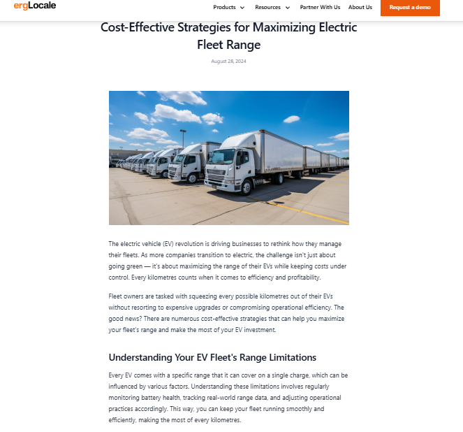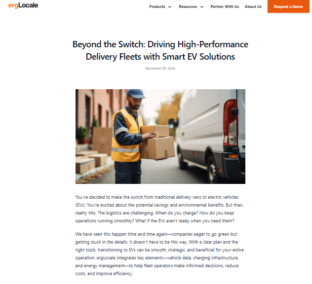 We built a content strategy focused on simplifying clean tech concepts and showcasing how their solutions maximize ROI from EV fleets and solar investments. The themes centered onhighlighting how ergLocale is driving the future of EV fleet and solar energy management, showcasing solutions that help organizations get the most out of their EV fleets and solar investments and simplifying technical concepts to engage decision-makers and build trust in ergLocale’s expertise.